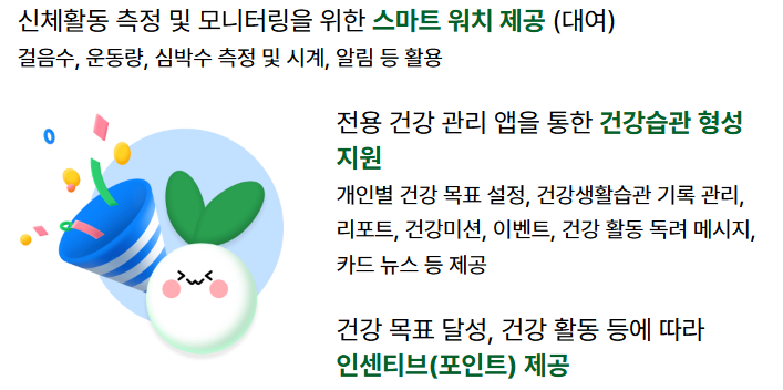 - 건강미션 및 이벤트: 꾸준한 건강생활을 독려하기 위한 다양한 미션과 이벤트가 제공됩니다.