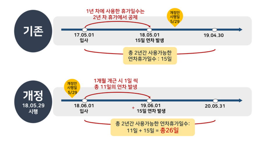 개정된 연차휴가에 따라 입사한지 만 1년이 되었다면 총 26일의 많은 연차가 주어지게 됩니다.