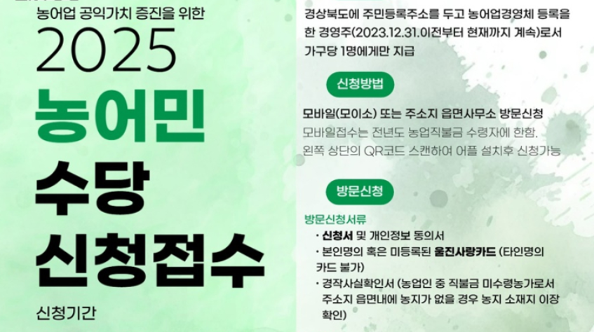 2025년 기준, 농어민 수당은 연간 60만원(상반기/하반기 분할)으로, 지역화폐 또는 선불카드 형태로 지급됩니다. 일부 시군은 모바일 지역상품권으로도 제공됩니다.