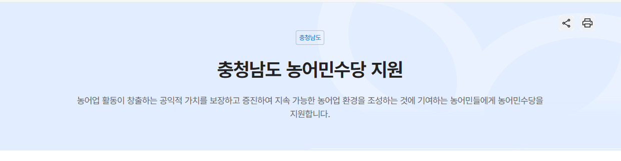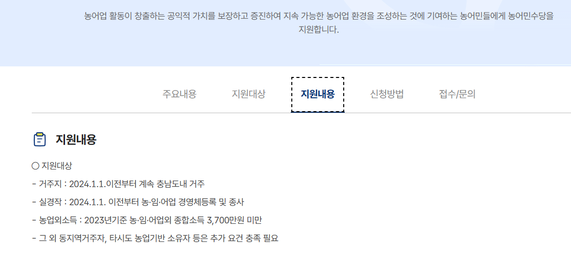 충청남도는 대상이 되는 모든 시·군 주민을 대상으로 농어민 수당을 지원하고 있습니다.