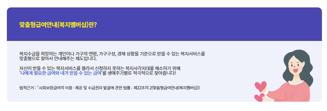복지멤버십은 정부에서 제공하는 다양한 복지서비스를 국민 개개인의 상황에 맞춰 맞춤형으로 추천해주고, 수급 가능 여부를 미리 알려주는 통합 서비스입니다. ‘정부24’ 홈페이지 또는 ‘복지로’ 사이트에서 간단히 가입만 하면 본인이 놓치고 있었던 복지혜택들을 한눈에 확인할 수 있으며, 각종 혜택을 빠르게 신청할 수 있는 통합 맞춤형 복지정보 플랫폼입니다.