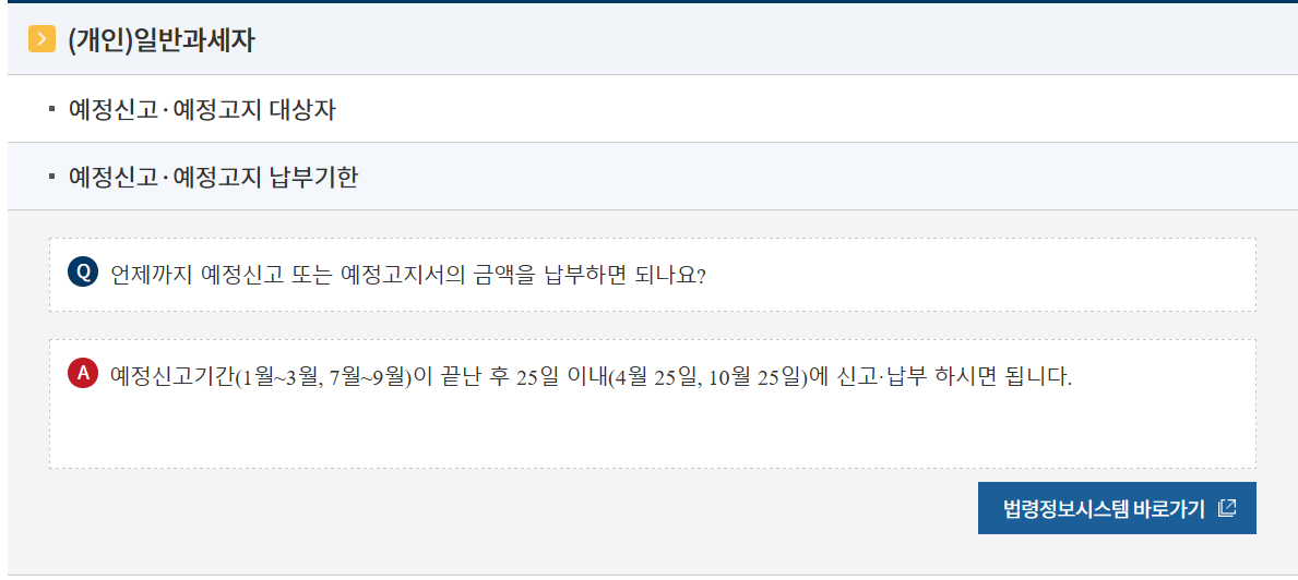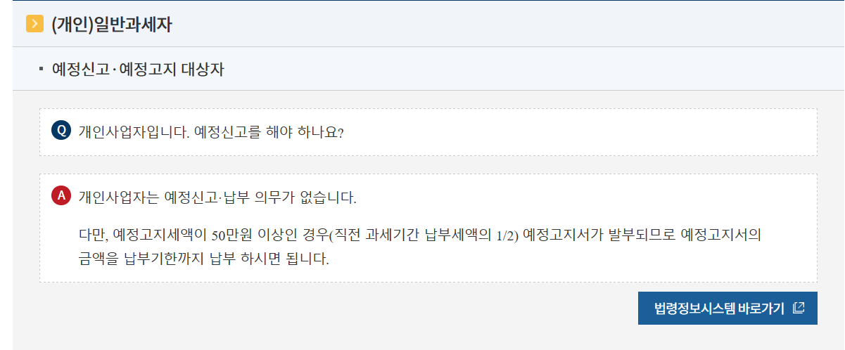 예정신고 대상이 아니라 예정고지를 받은 사업자는 별도 신고 없이 납부만 하면 됩니다. 고지서는 국세청 홈택스나 우편으로 발송되며, 납부만 기한 내에 진행하면 됩니다.
