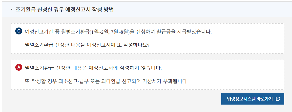 예정신고에서는 환급 신청이 불가능하며, 환급세액이 발생했더라도 7월 확정신고에서만 환급을 받을 수 있습니다. 따라서 환급을 목적으로 하는 신고는 예정신고 대상이 아님에 유의하세요.