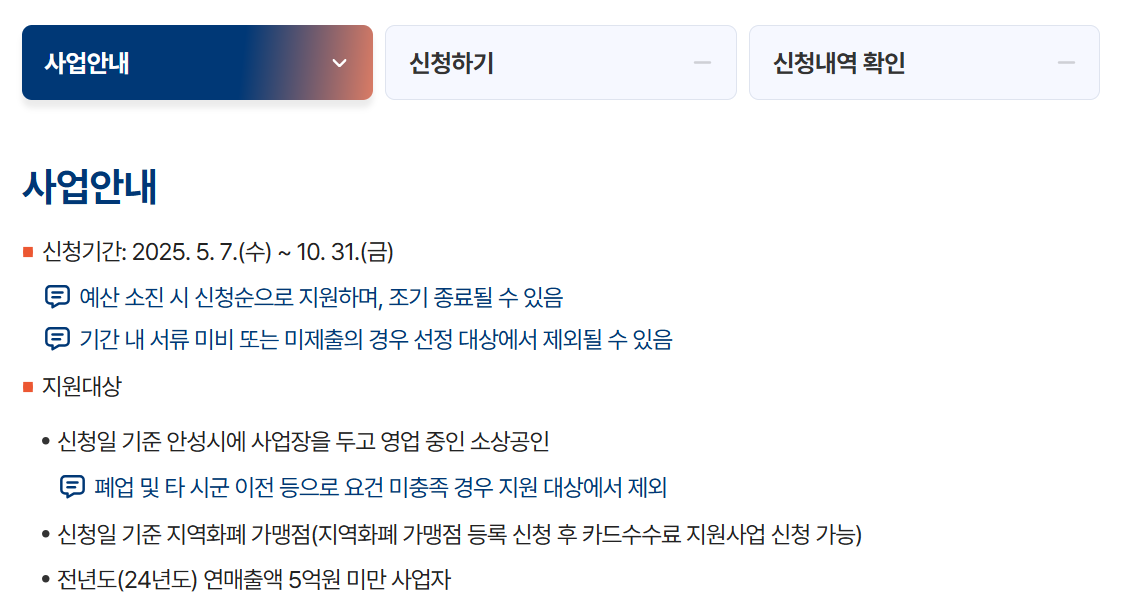 2024년도 연매출이 5억원 미만인 소상공인을 대상으로 하며, 안성사랑카드 가맹점으로 등록된 사업체만 신청할 수 있는 제도입니다. 카드결제를 주로 받는 소상공인들에게 실질적인 도움이 될 수 있습니다.