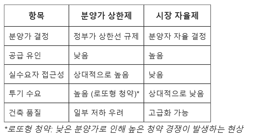 | 항목 | 분양가 상한제 | 시장 자율제 |