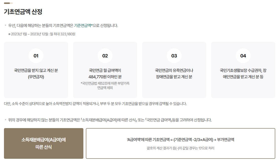 특히 나의 월 소득 뿐만 아니라 국민연금 수령액 역시 기초연금에 영향을 주게 되는데요, 내가 국민연금을 얼마 받느냐에 따라 기초연금도 달라지므로 확인해야 합니다.