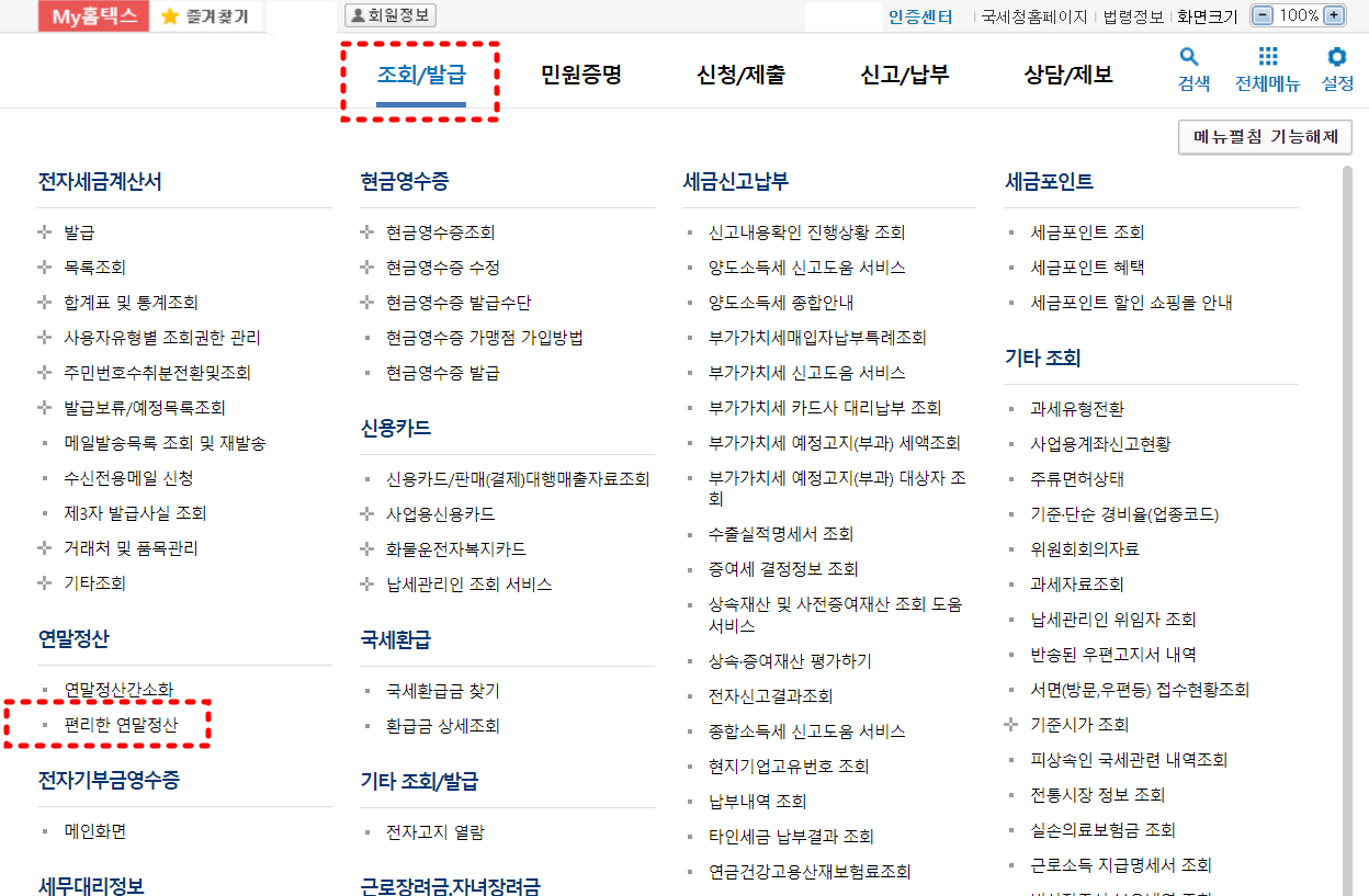 국세첨 홈택스 홈페이지에 접속해서 '조회/발급' 메뉴에 마우스를 올려놓으면 왼쪽 '편리한 연말정산'이 보입니다. 이것을 클릭해 줍니다.