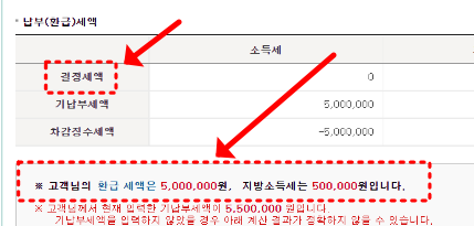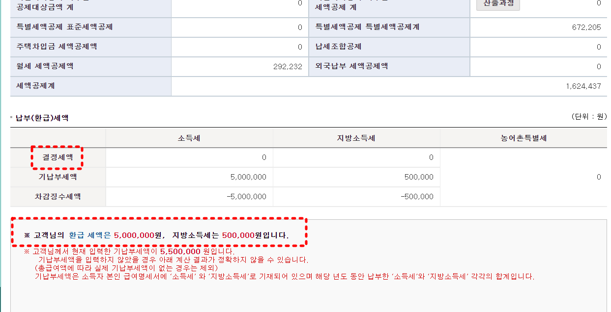 그러면 이와 같이 내가 내야 할 세금이 나타나게 됩니다. 이것은 나의 작년 수입 대비 원래 내야 할 세금을 나타내는 것입니다. 내가 실제 낸 세금에서 '결정세액' 금액을 빼면 내가 돌려받을 금액입니다.