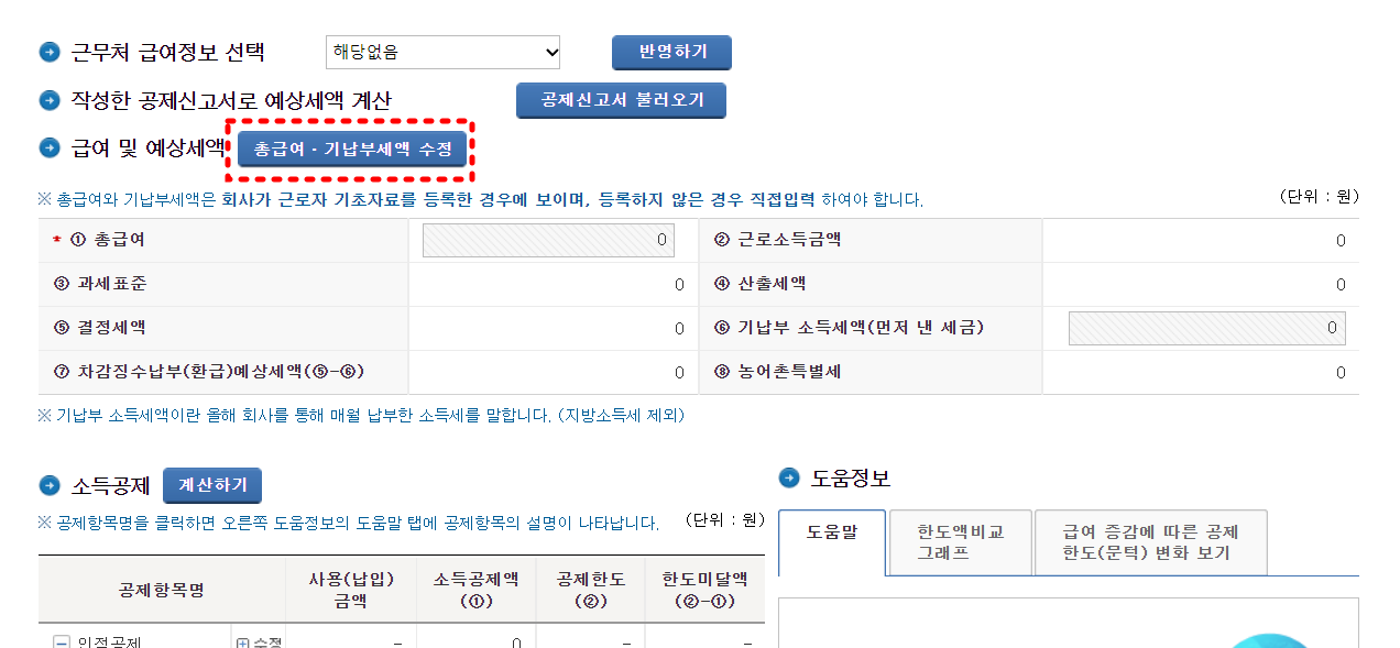 '공제신고서 불러오기'를 눌러주면 내가 제출한 공제신고서와 내역이 나오게 됩니다. 그리고 근무처 급여정보 선택 항목에 '반영하기'를 눌러줍니다.