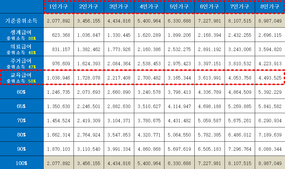 자세한 기준은 해당 중위소득표를 참고하시면 됩니다.