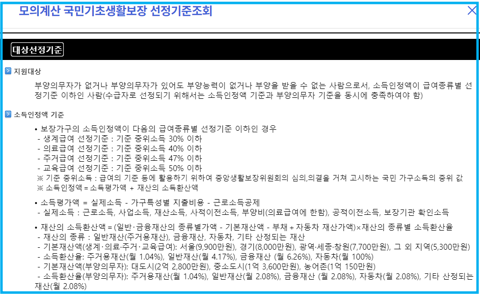 복지로 홈페이지 내에서 '기초생활 수급자 모의계산'을 통해 중위소득액을 산출하실 수 있습니다.