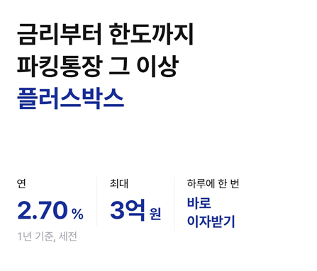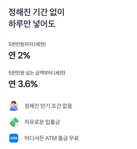 | 토스뱅크 | 파킹통장 | 평균 2.3% (5천만원 이상 4%) | ||