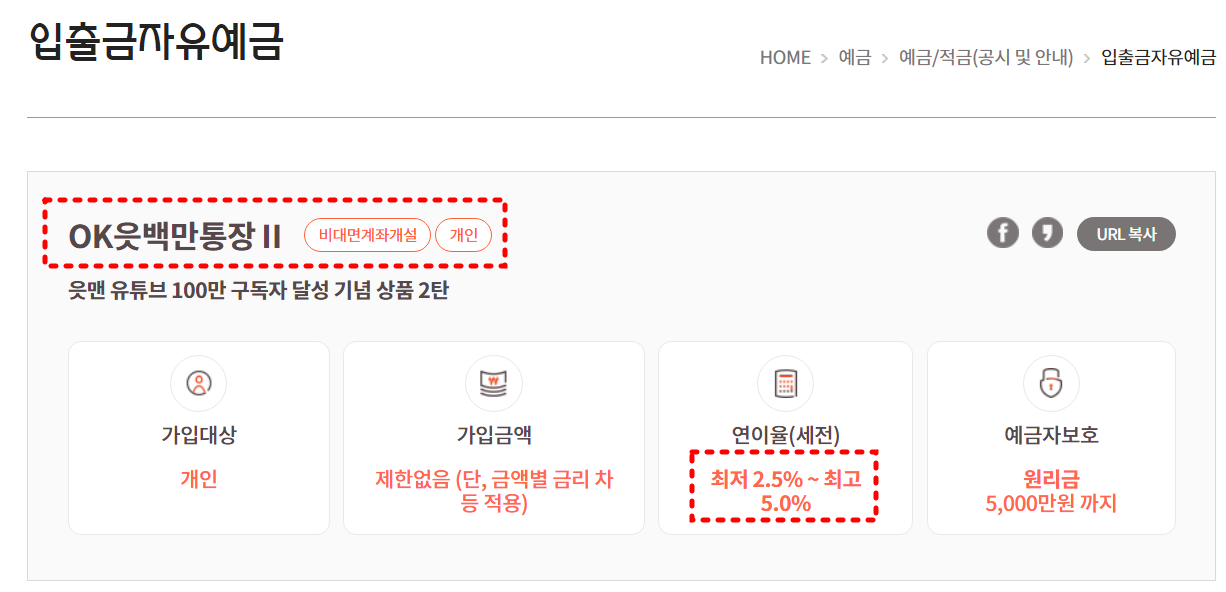 | OK저축은행 | OK 읏통장 | 평균 3.3% (1백만원 이하 4.5%, 초과 ~ 5백만원 3.5% 등 차등) | ||