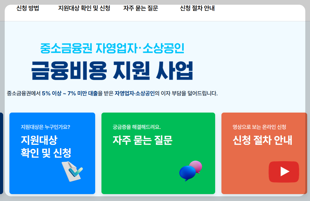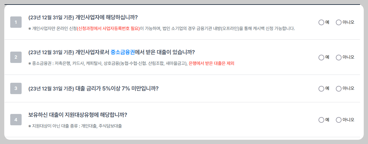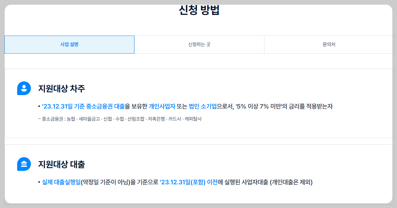 '23.12.31일 기준 중소금융권 융자를 보유한 개인사업자 또는 법인 소기업으로서, '5% 이상 7% 미만'의 금리를 적용받는자는 신청가능합니다.