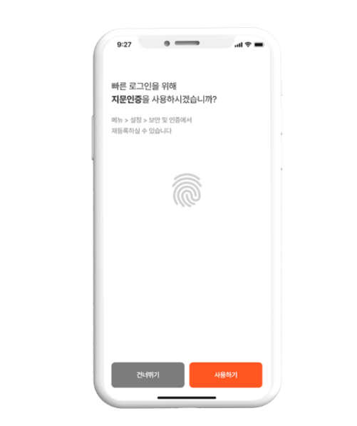 빠른 로그인을 위한 생체비밀번호(지문) 등록을 해 줍니다.쉽게 가입이 완료되었습니다.