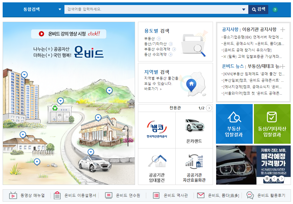 온비드(ONBID)는 매수희망자(일반회원)와 자산처분기관(이용기관회원)을 위한 공매정보 조회 및 전자입찰 서비스를 제공하는 편리한 온라인 플랫폼입니다.