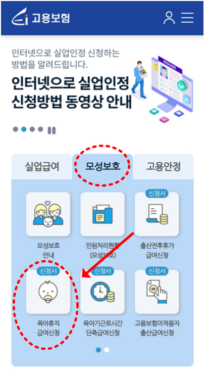 2.앱 내 '모성보호' 메뉴에서 '육아휴직 급여 신청'을 선택합니다.