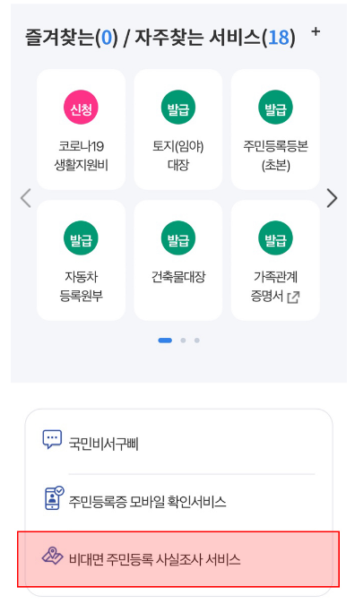 정부24 앱의 메인 화면에서 '비대면 주민등록 사실조사 서비스' 바로가기를 찾아 클릭합니다.