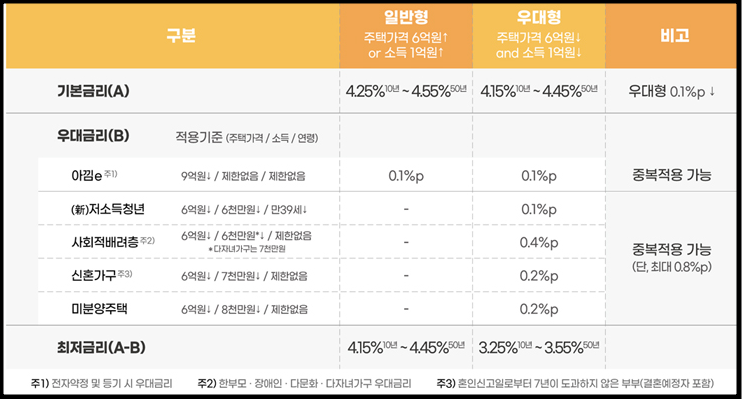 기본금리는 4.25~4.55까지 이고 주택가격이 6억원 이하이면서 소득이 1억원 이하이면 4.15%부터 시작합니다. 아낌e, 저소득청년, 사회적배려층, 신혼가구, 미분양주책에 해당이 되면 우대형 0.1% 더 저렴한 금리로 가능합니다.