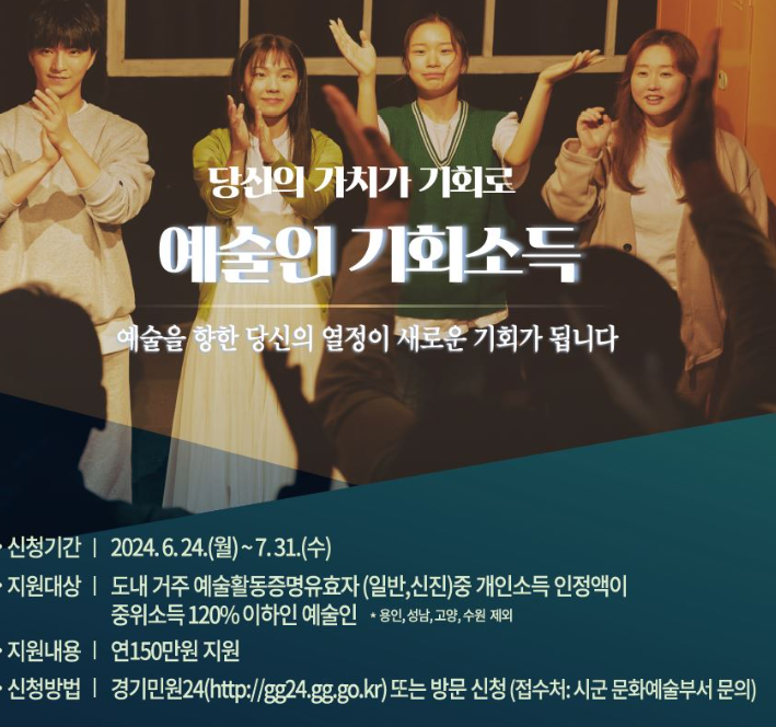 2024년 예술인 기회소득 지원사업에 대해 안내드립니다. 예술 활동을 통해 창의성과 열정을 발휘하는 여러분에게 힘을 실어드리고자 마련된 이 지원사업에 많은 관심 부탁드립니다.