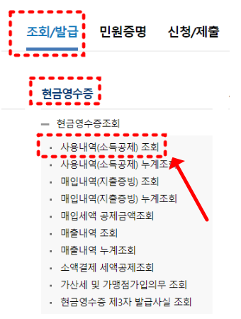내가 연말정산을 위해 현금영수증을 조회해보고 싶다면 첫번째에 있는 '사용내역(소득공제) 조회'를 눌러주세요.
