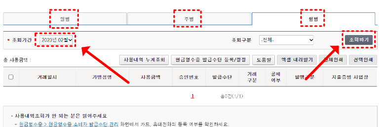 3. 또한, 당일에 등록한 현금영수증은 내역조회가 안됩니다.