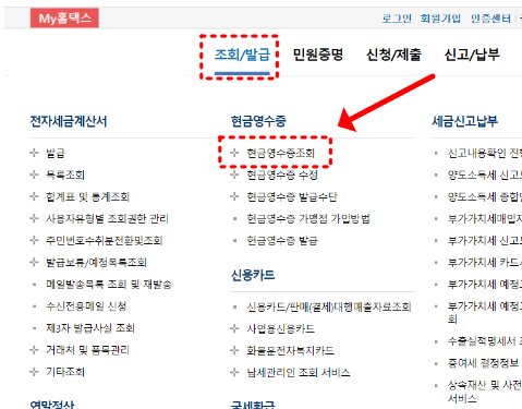 여기서 '현금영수증 발급' 을 눌러주시면 해당 업무를 보실 수가 있습니다. 이후에 방법은 간단하기 때문에 쉽게 가능합니다.