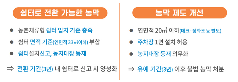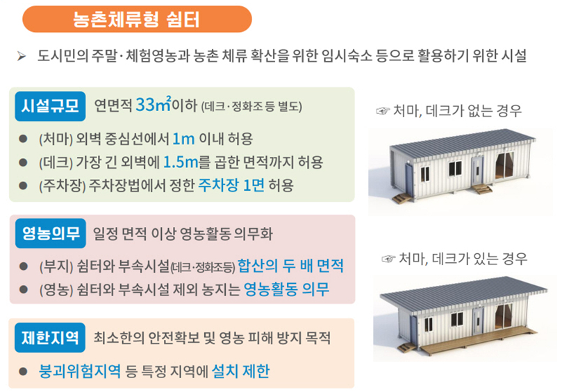 기존 농막은 숙박이 원칙적으로 불가능했으나, 새롭게 도입되는 쉼터에서는 취사와 취침이 가능해 도시민의 주말 농촌 생활을 촉진하고자 합니다. 기존의 농막을 활용할 수도 있으니 조건을 잘 확인하시기 바랍니다.