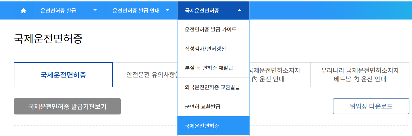사이트 접속 후, 상단 메뉴에서 "국제운전면허증 발급"을 클릭합니다.